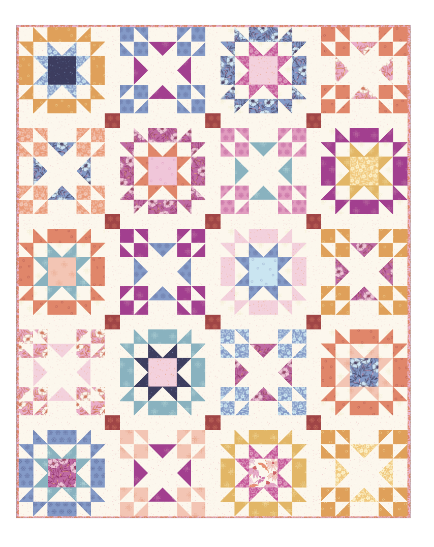 One of my favorite free projects is the Stitched in Stars Quilt. It’s made with classic Amish Star blocks, but with the fresh colors of Petals & Stitches it feels so bright and timeless. It’s also a wonderful skill-building quilt, the kind you’ll enjoy making and feel so proud of when it’s finished.